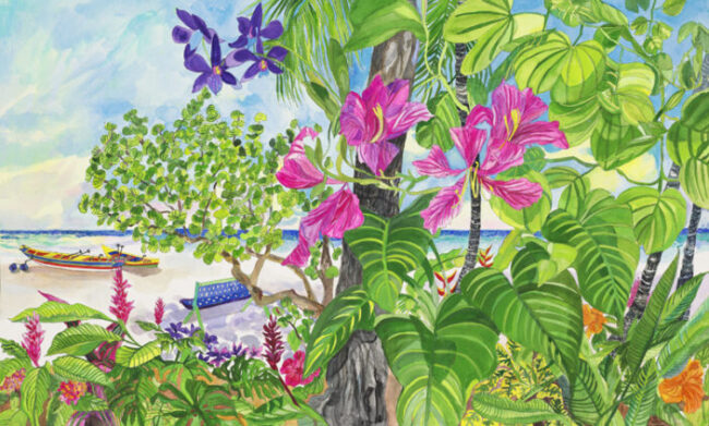Eileen Seitz’s new watercolor “Blue Bench on the Beach” sounds absolutely captivating! The image of two boats resting on a sunlit beach with a peaceful blue bench awaiting someone to relax—paired with the beauty of a blooming orchid tree—creates such a serene, almost dreamlike atmosphere. It really feels like a perfect escape, like stepping into a calm, untouched paradise where the only sound is the breeze and the gentle lapping of the water.