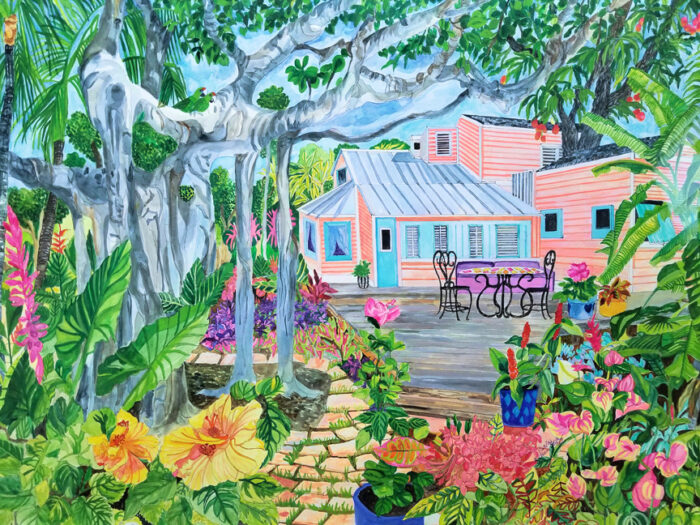 Eileen’s creative journey led her to discover this captivating house while driving through the south side of Coconut Grove. What caught her eye was the striking use of color that adorned the house’s exterior. Unable to resist the allure, Eileen stopped and was graciously invited by the homeowner to explore both the house and its enchanting backyard.